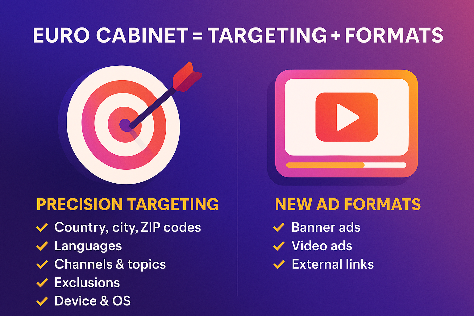 99% of your competitors don’t even know Euro Cabinet exists. If you’re among the first to use precise targeting + rich formats in these emerging markets, you’ll lock in cheap CPMs and capture audiences while they’re still wide open.