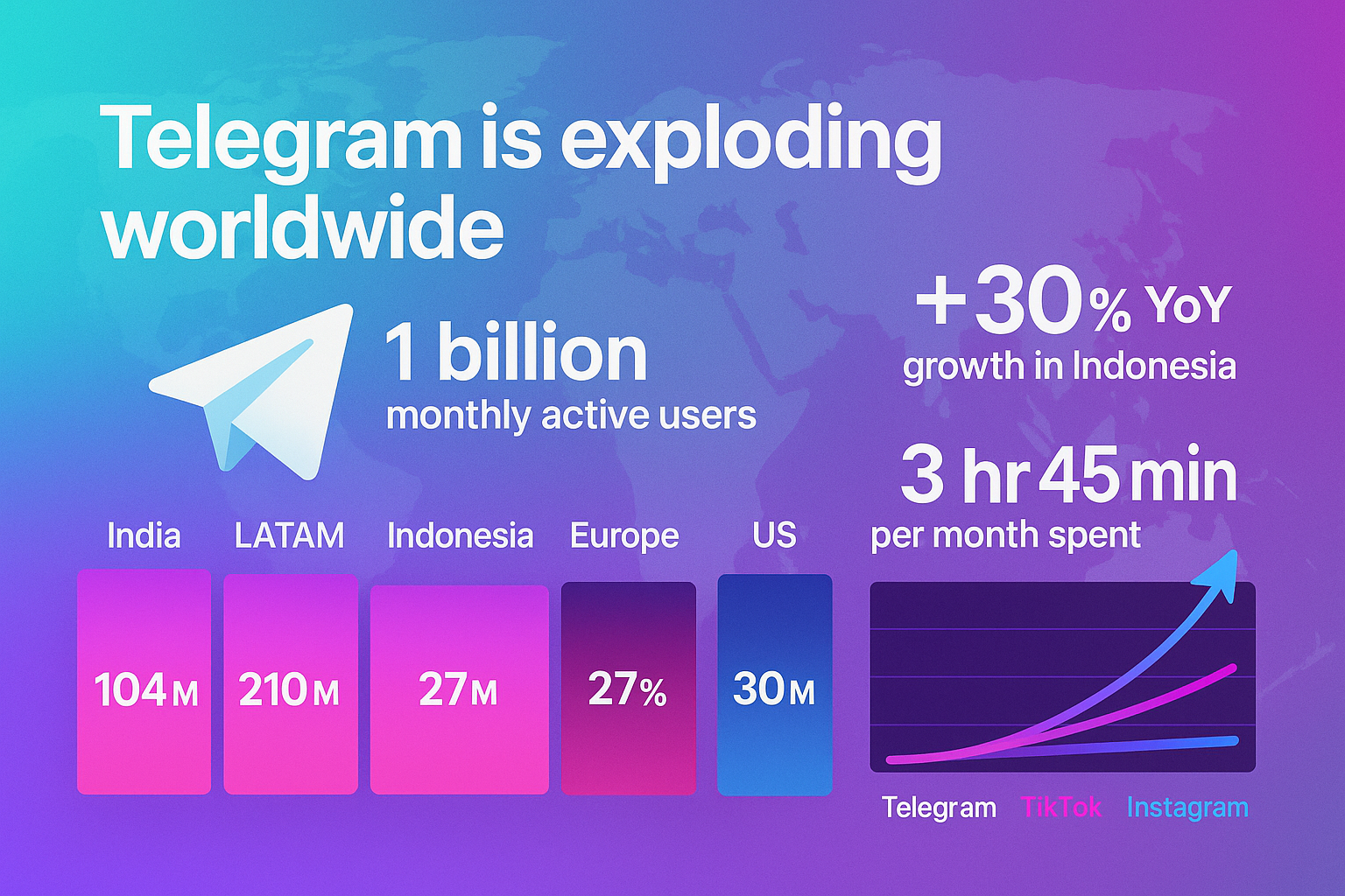 - Europe & US: steady adoption with 25–30 million users in the US and ~27% of Telegram’s user base in Europe.